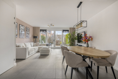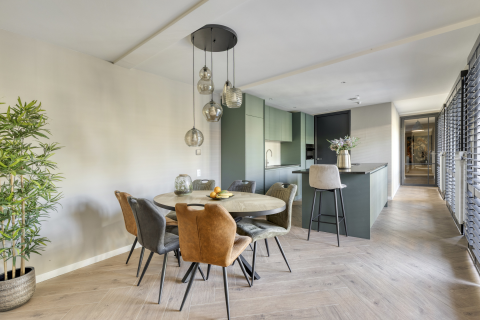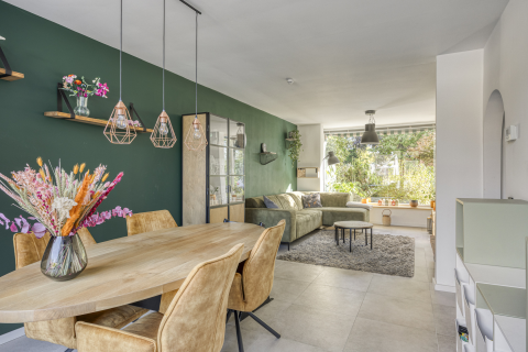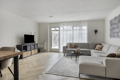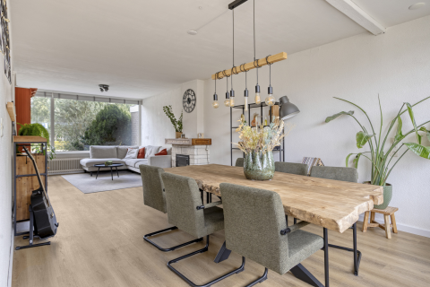 De woonkamer is ruim en praktisch ingedeeld. Het eetgedeelte biedt voldoende ruimte voor een royale tafel met 4 tot 6 stoelen, ideaal voor etentjes met vrienden of familie. Het zitgedeelte is tuingericht en geniet van veel lichtinval door de grote aluminium schuifpui in de achtergevel. In de woonkamer is een luxe mediameubel geplaatst met een elektrische inbouwhaard die zorgt voor sfeer en gezelligheid. Er is voldoende ruimte voor een royale hoekbank om lekker in te ontspannen.